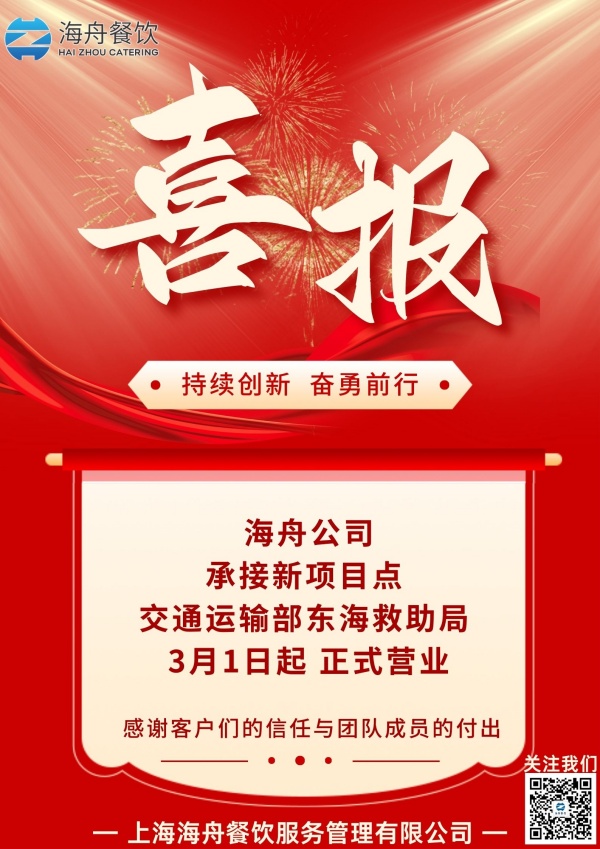 我司與交通運(yùn)輸部東海救助局正式建立合作。東海救助局餐廳在3月1日正式開業(yè)。每一個(gè)成績都是我們前進(jìn)的動(dòng)力。我司將持續(xù)創(chuàng)新,致力于高品質(zhì)、綠色、健康的餐飲服務(wù)。