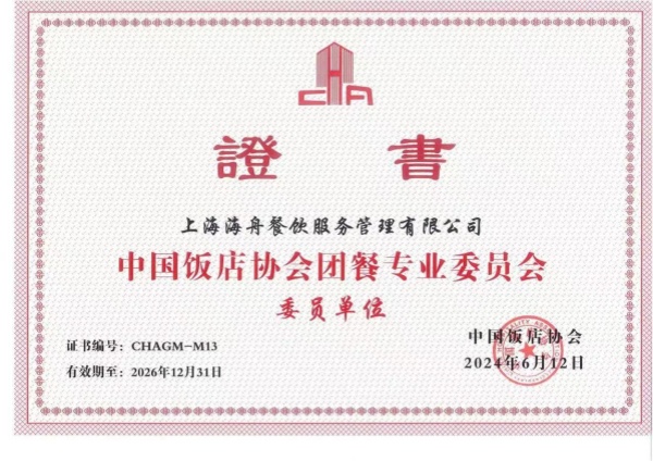 6月12日,海舟公司榮獲“中國飯店協(xié)會團餐專業(yè)委員會委員單位”