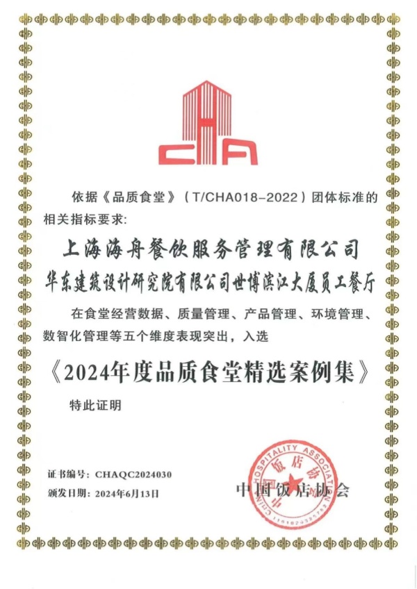 華東設(shè)計院濱江餐廳在多個關(guān)鍵維度上獲得了團餐行業(yè)內(nèi)的高度認可,榮獲“2024年度品質(zhì)食堂”稱號并入選“2024年度品質(zhì)食堂精選案例集”